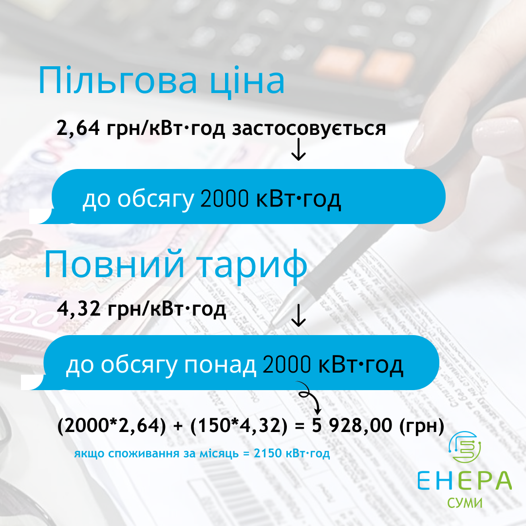 Наприклад, при споживанні 2150 кВт∙год отримаєте рахунок на суму 5 928 гривень, адже по 4,32 грн рахуватимуть лише 150 кіловат-годин, решту — за ціною 2,64 грн.