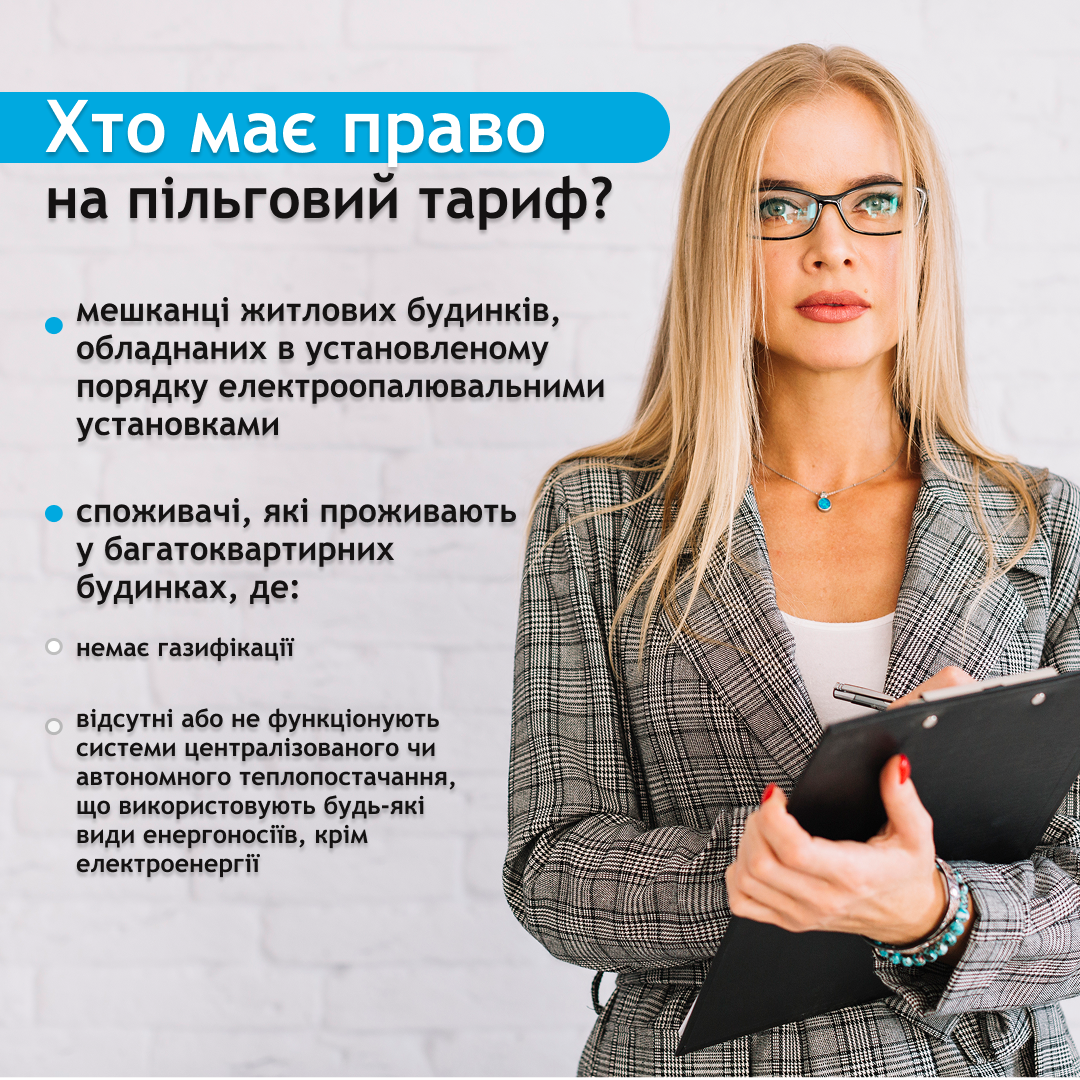 З 1 жовтня по 30 квітня (включно) побутові споживачі, які мають електроопалення або проживають у багатоквартирних будинках, що не газифіковані, можуть сплачувати за електроенергію за пільговою ціною. При цьому за зниженим тарифом рахують перші 2000 кВт∙год, навіть, якщо за місяць використали більше, а за повним — тільки перевищення.