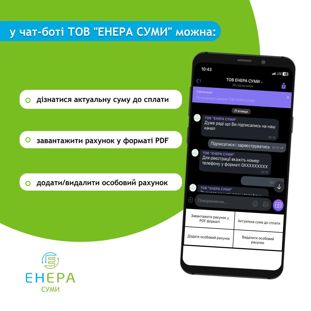 ТОВ "ЕНЕРА СУМИ" покращує дистанційне обслуговування споживачів. Відтепер компанія має чат-бот у Viber. Які функції доступні для користувачів та як ними скористатися — розповідаємо у матеріалі.
