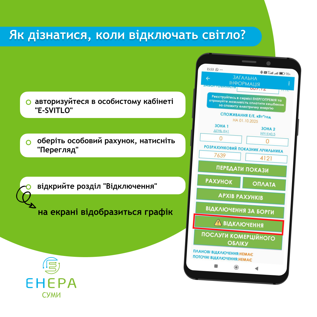 Найшвидший та найзручніший спосіб дізнатися свою чергу, підчергу і час знеструмлення — особистий кабінет "E-SVITLO". Саме там ви знайдете актуальні дані про відключення за вашою адресою та отримаєте повідомлення про будь-які зміни в графіку. Зверніть увагу: на початку та наприкінці знеструмлення передбачено +30 хвилин на здійснення перемикань.