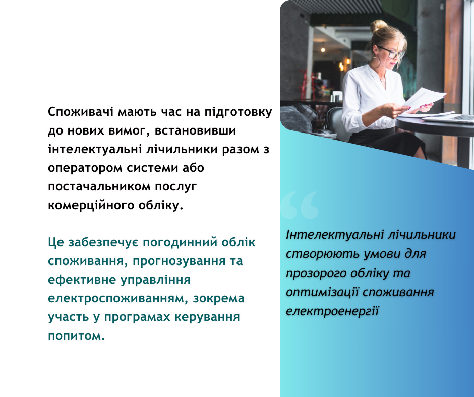 Споживачі, які є розпорядниками та одержувачами бюджетних коштів, час на підготовку до нових вимог. У співпраці з оператором системи або постачальником послуг комерційного обліку вони можуть встановити інтелектуальні лічильники з автоматичним щодобовим дистанційним зчитуванням даних.