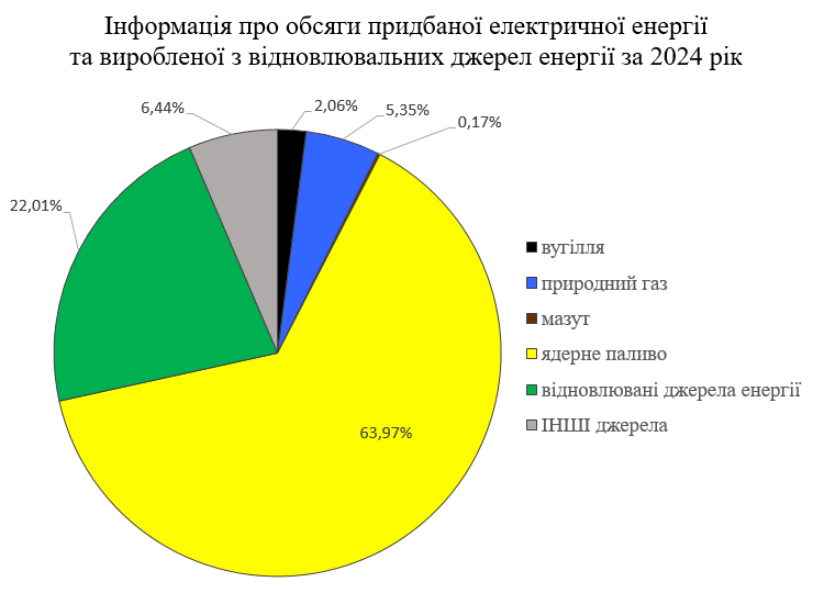 Інформація щодо частки кожного джерела енергії, яка була використана у загальній структурі балансу купленої та/або виробленої електричної енергії на власних електроустановках та вплив на навколишнє середовище, спричинений таким виробництвом електроенергії (питомі показники викидів CO2 та радіоактивне забруднення), за 2024 рік.