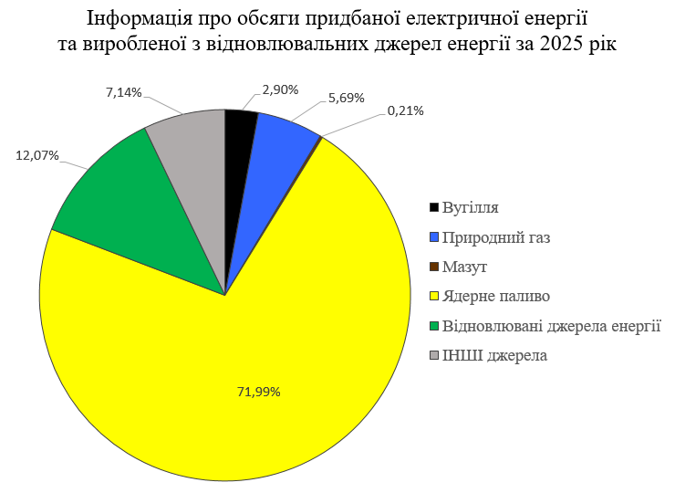 Інформація щодо частки кожного джерела енергії, яка була використана у загальній структурі балансу купленої та/або виробленої електричної енергії на власних електроустановках та вплив на навколишнє середовище, спричинений таким виробництвом електроенергії (питомі показники викидів CO2 та радіоактивне забруднення), за 2025 рік.