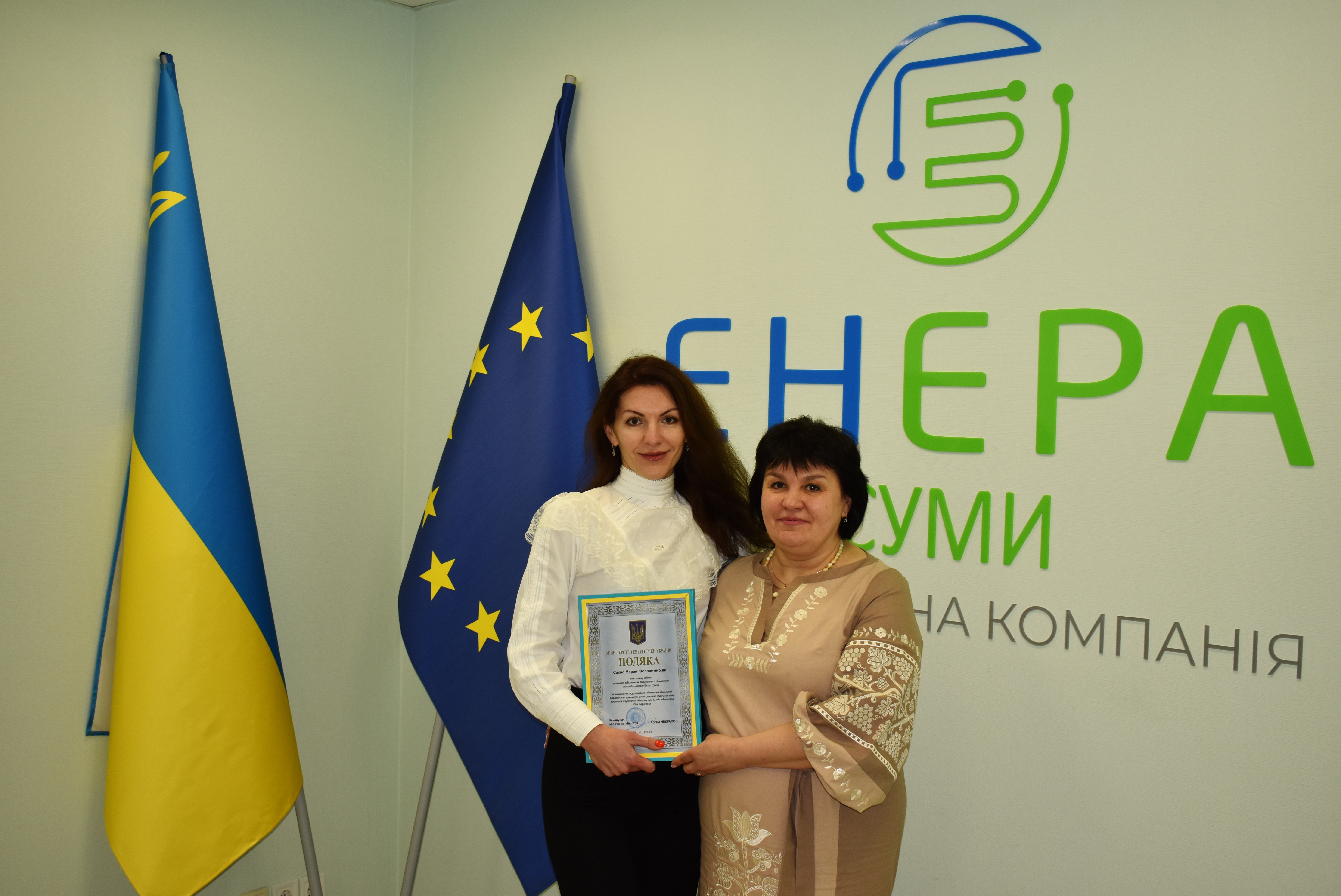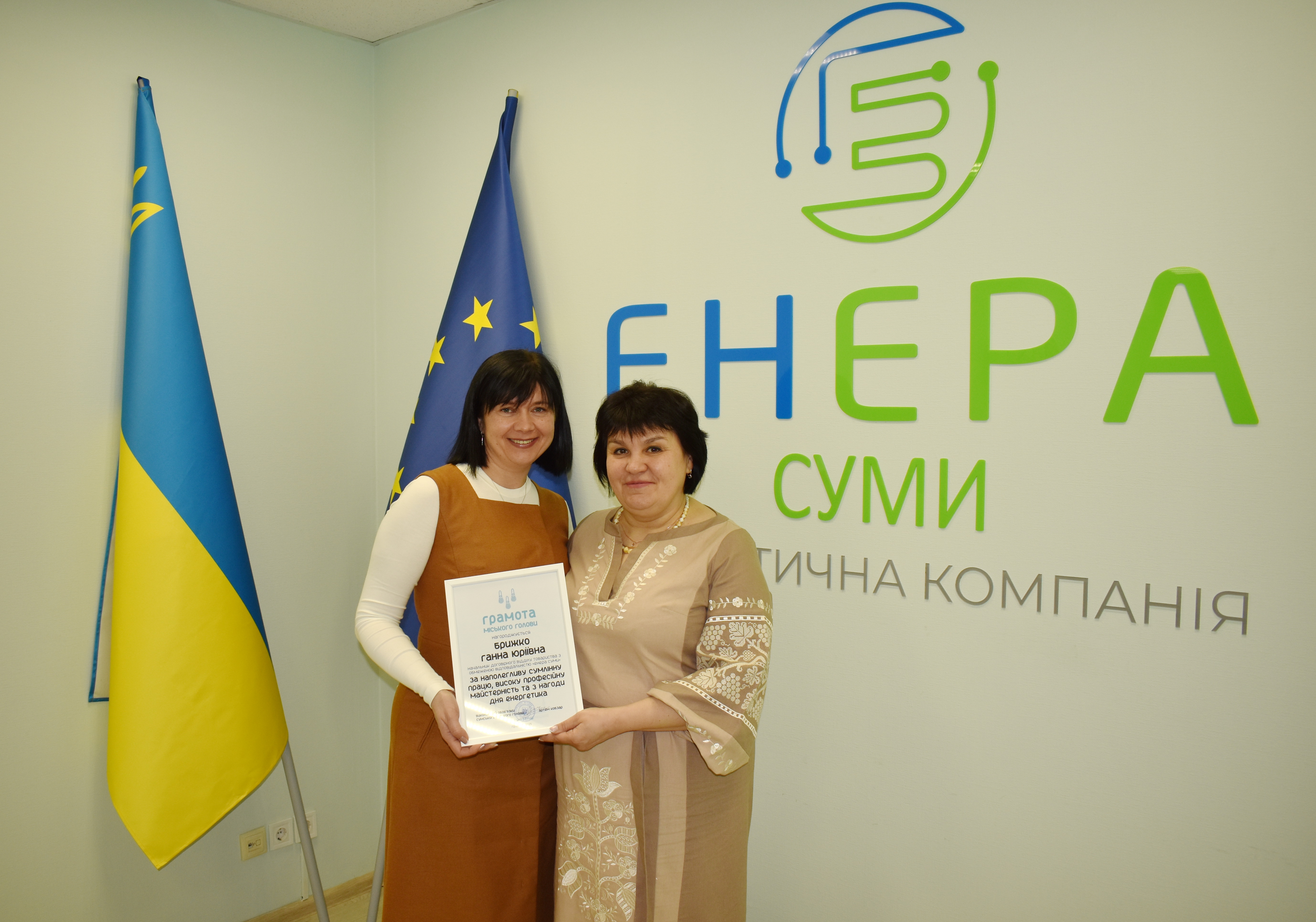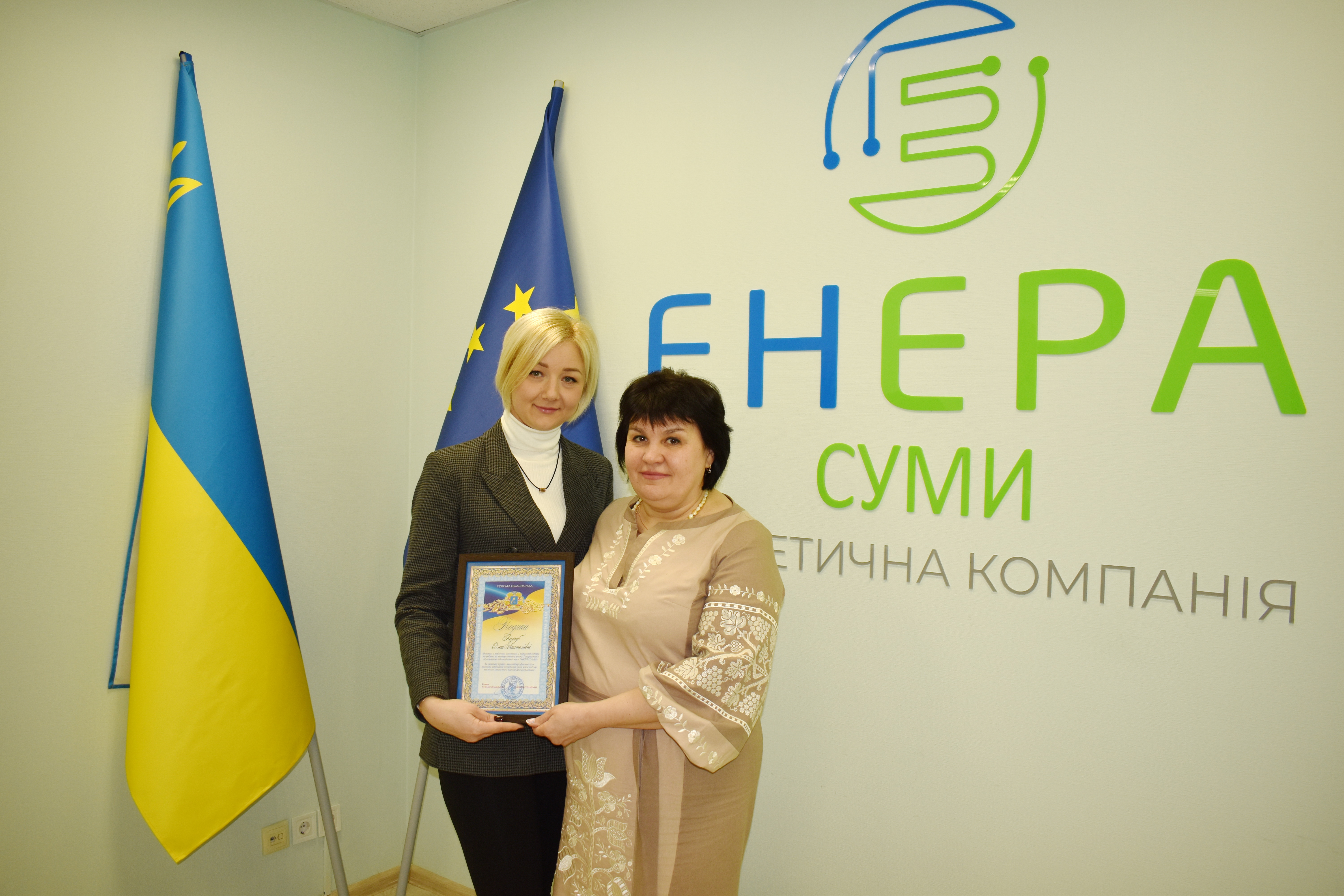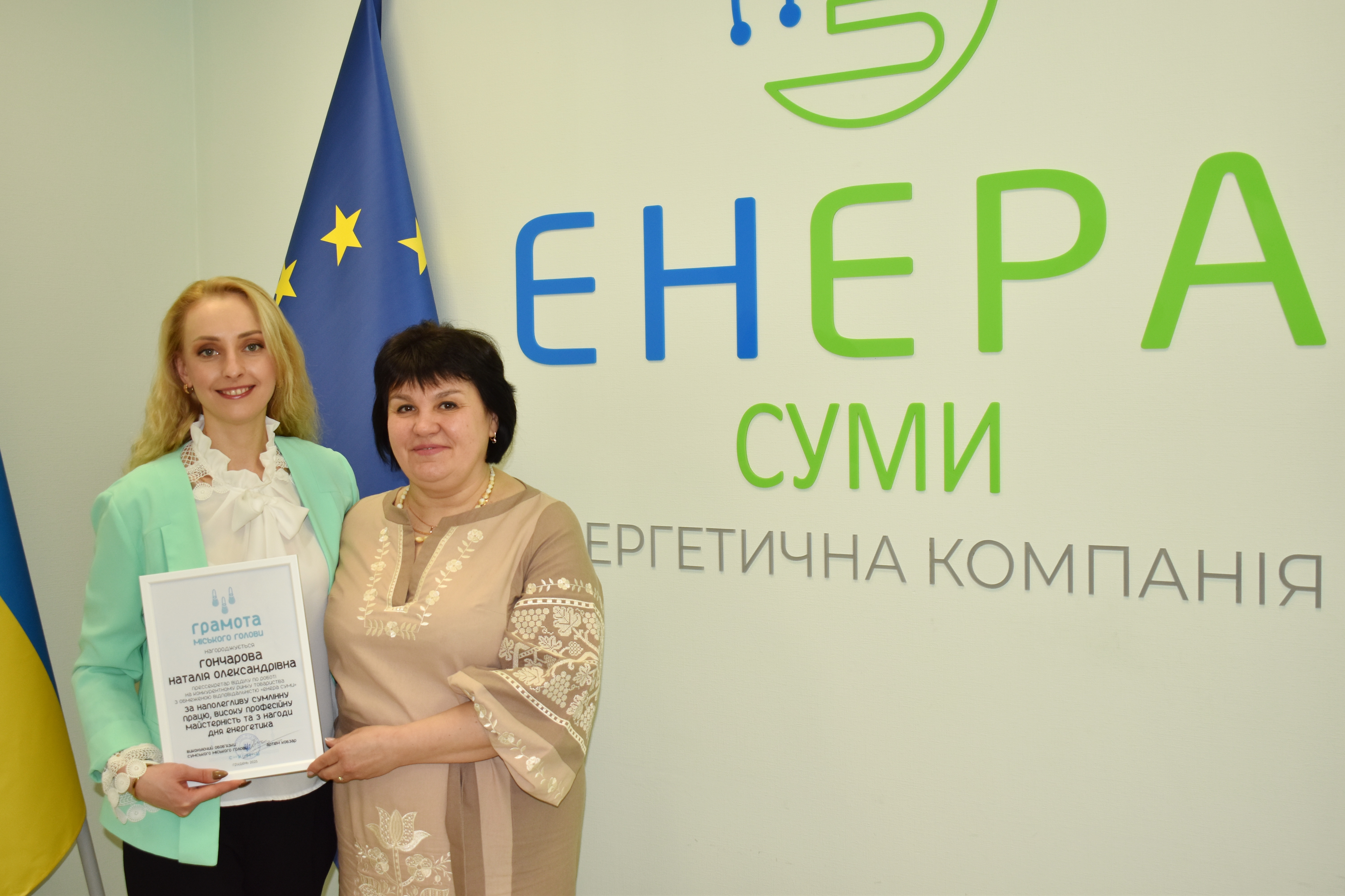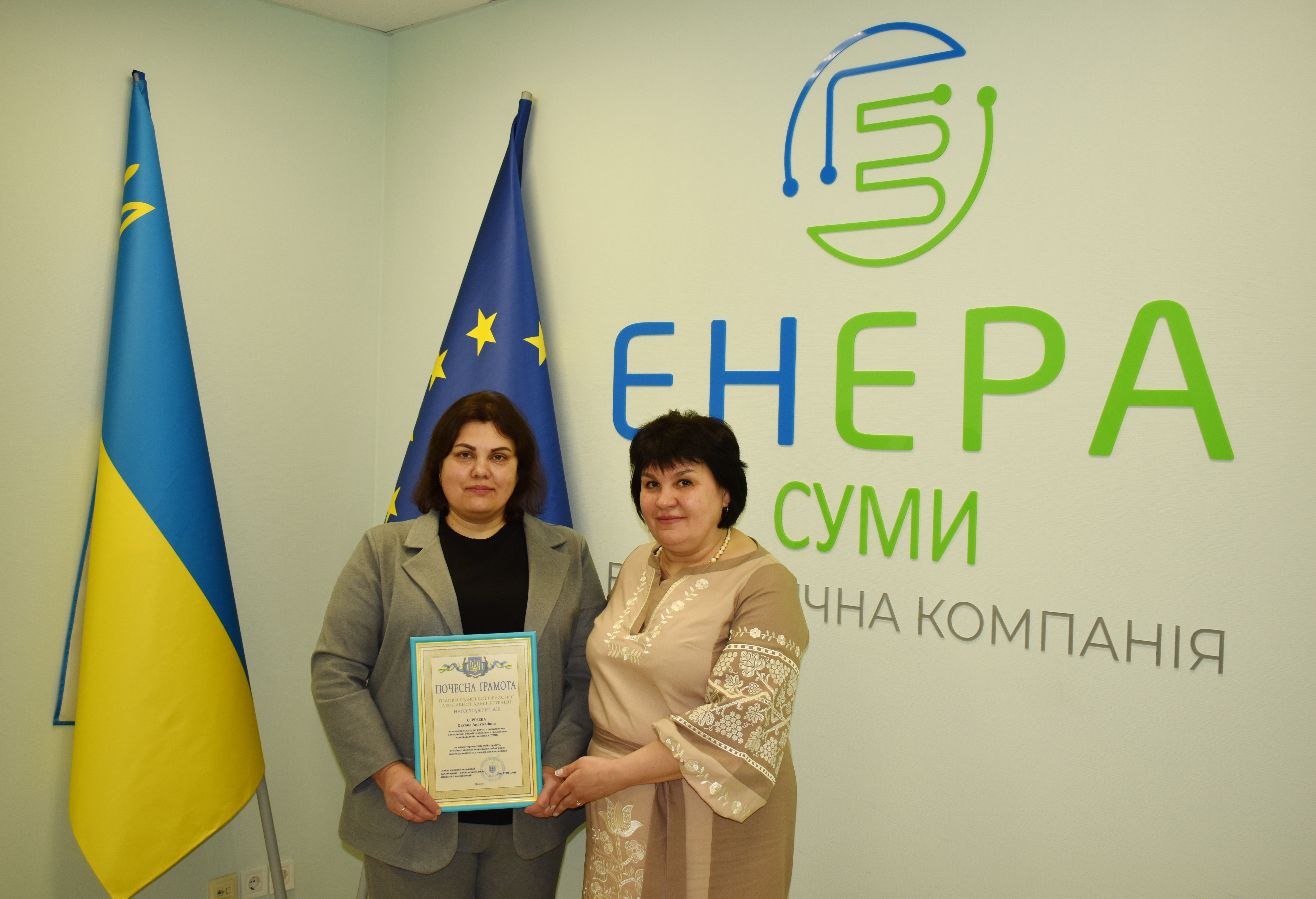 Директора ТОВ "ЕНЕРА СУМИ" нагороджено нагрудним знаком "Відмінник енергетики України". Подяку Міністерства енергетики України оголошено начальнику відділу з правового забезпечення Марині Сахно та головному адміністратору Білопільського центру обслуговування клієнтів Сергію Дорошенку.