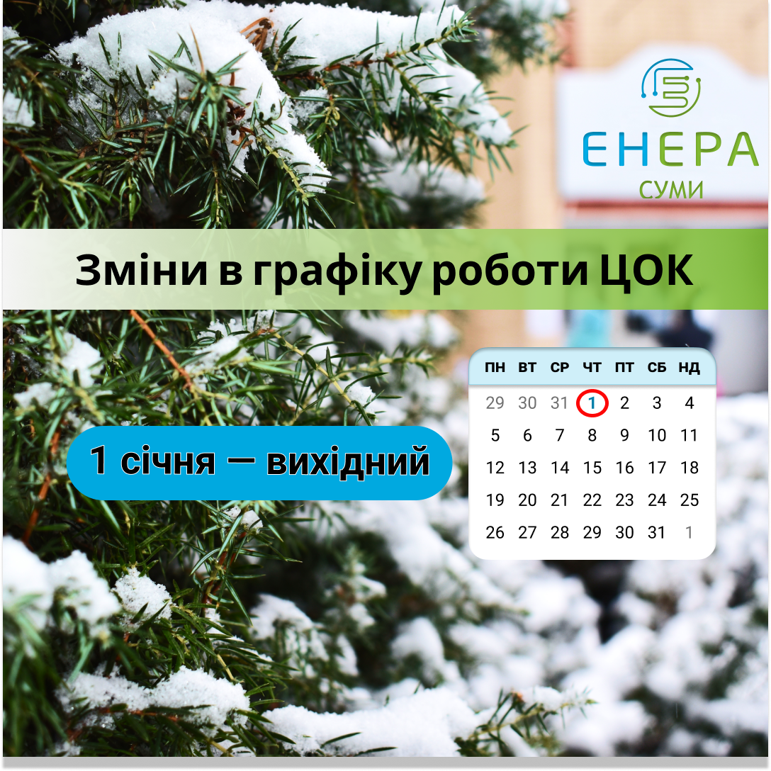 У четвер, 1 січня 2026 року, центри обслуговування клієнтів ТОВ "ЕНЕРА СУМИ" тимчасово не працюватимуть.