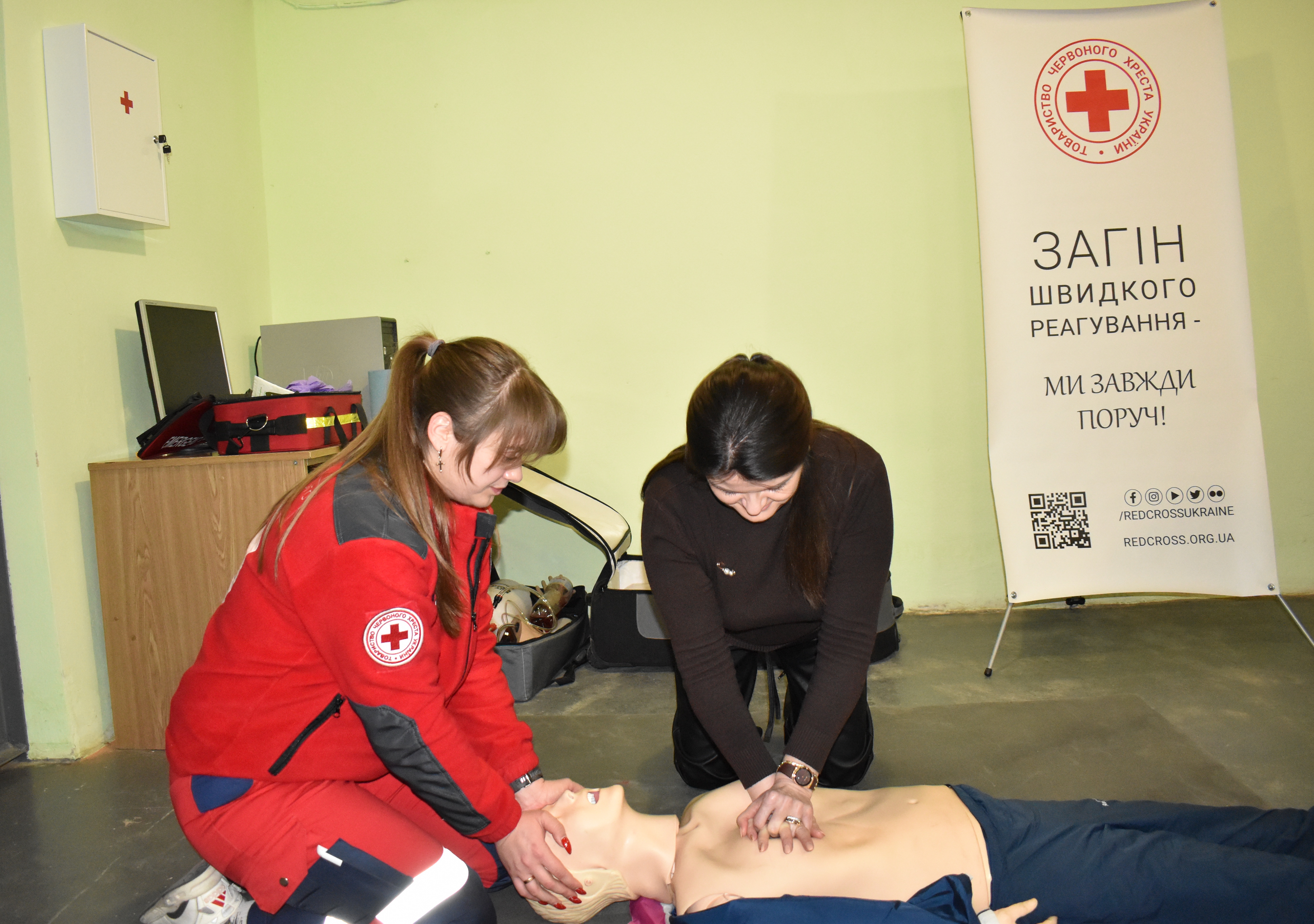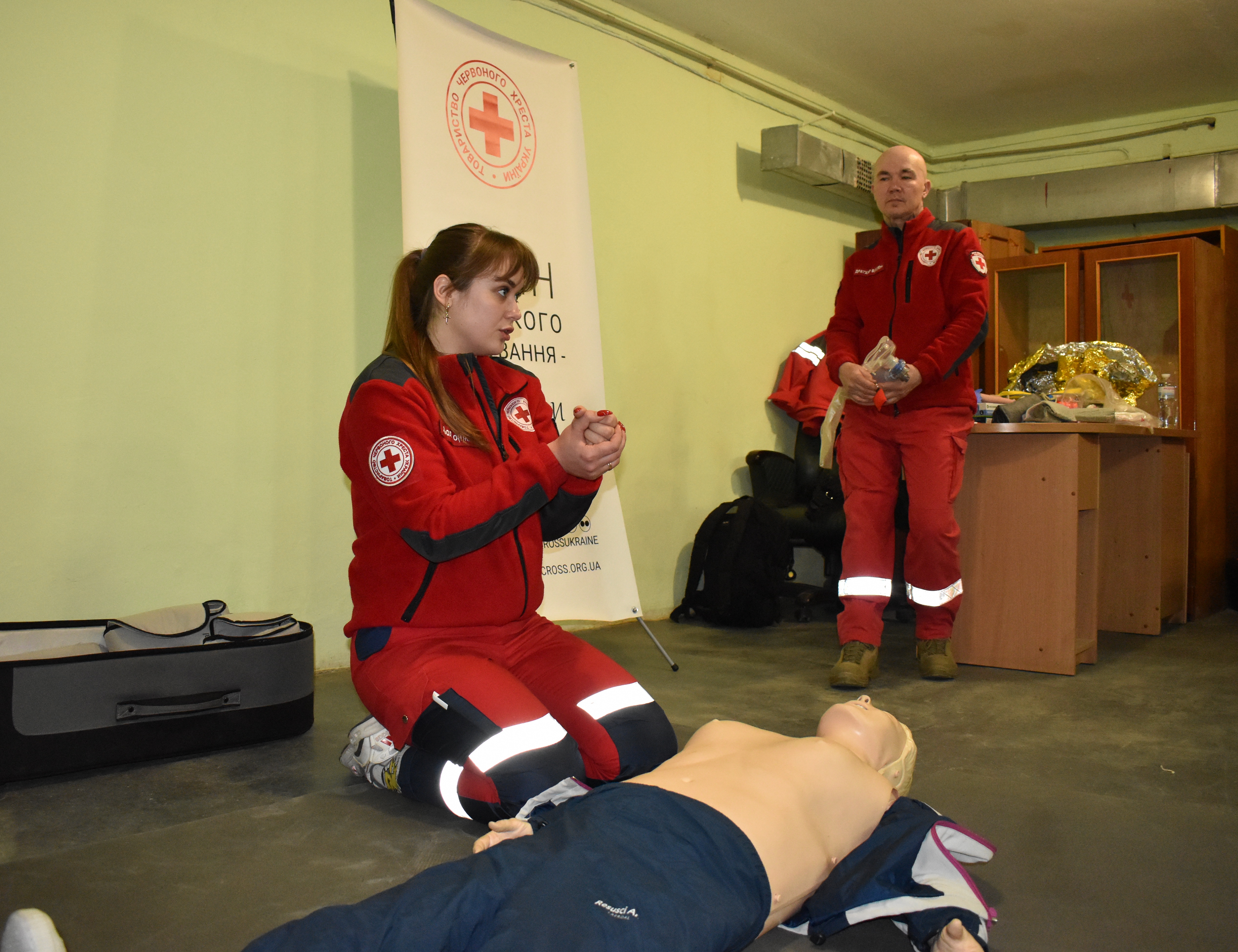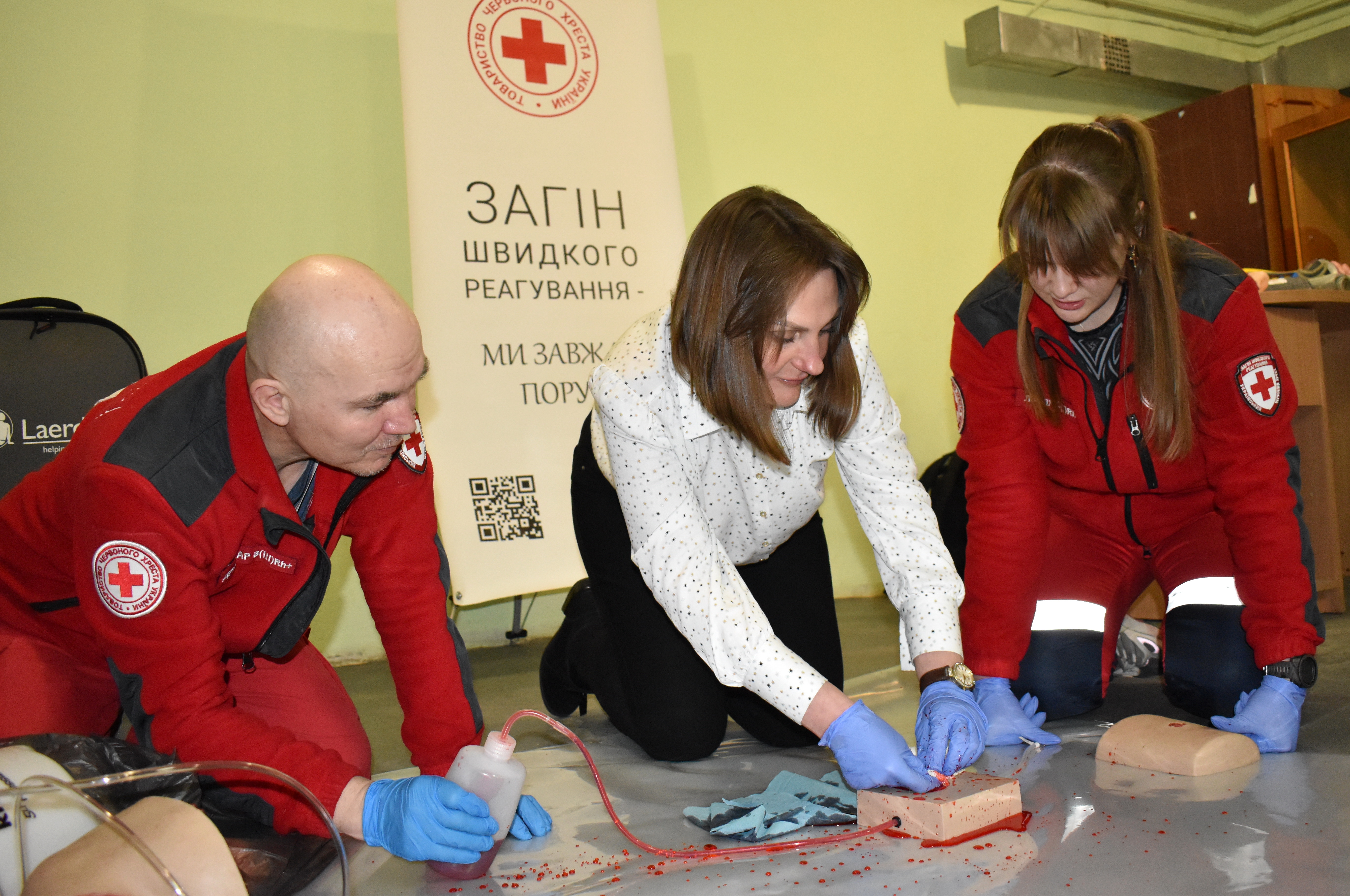 Працівники вчилися зупиняти кровотечі, зокрема, тампонувати рани і накладати турнікет, відпрацьовували серцево-легеневу реанімацію на манекені, а також опановували стабільне бокове положення для допомоги людині без свідомості.