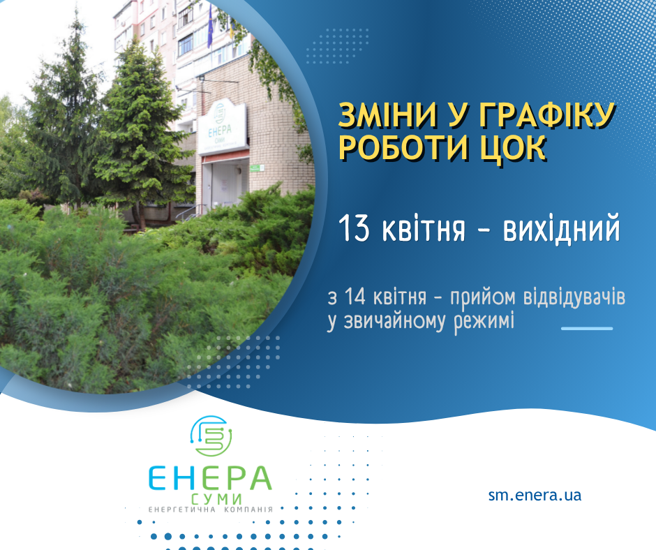 Інформація для споживачів: режим роботи центрів обслуговування клієнтів ТОВ "ЕНЕРА СУМИ" на великодні свята